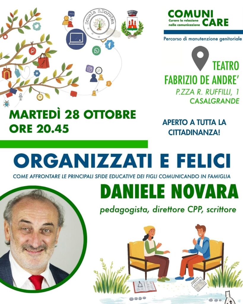 È in programma per martedì 28 ottobre alle ore 20:45, presso il Teatro De André di Casalgrande, la conferenza organizzata dalla Scuola Santa Dorotea con Daniele Novara, pedagogista e scrittore, fondatore e direttore del CCP (Centro Psicopedagogico per l’educazione e la gestione dei conflitti) tra i più autorevoli esperti italiani di educazione e comunicazione relazionale.